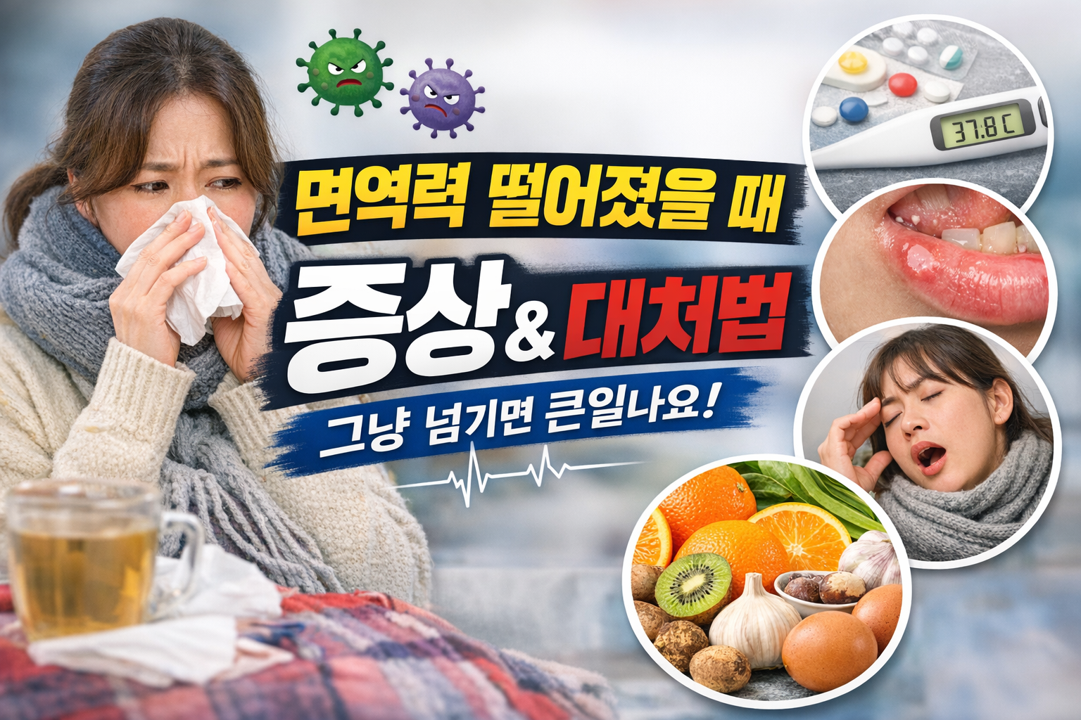 겨울철이나 환절기가 되면 특별히 아픈 곳이 없어도 몸이 무겁고 쉽게 피로해지는 경우가 많습니다. 감기가 자주 걸리거나, 입병이 반복되고, 잠을 자도 개운하지 않다면 단순한 컨디션 난조가 아니라 면역력 저하 신호일 가능성이 큽니다.