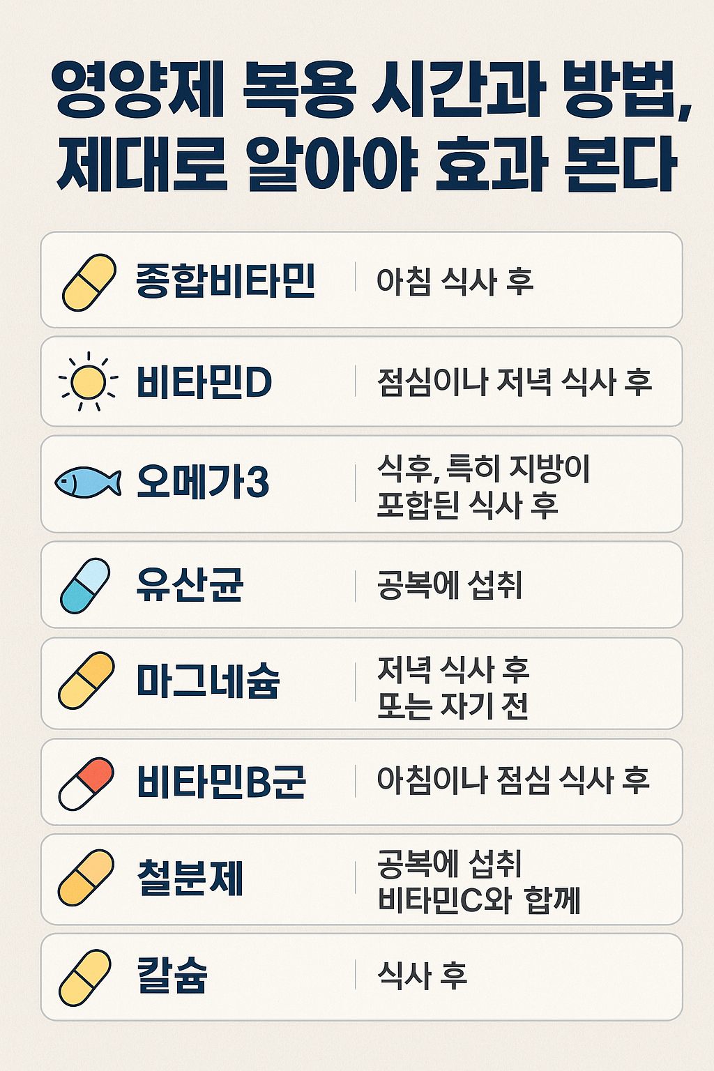 영양제는 언제, 어떻게 먹느냐에 따라 효과가 달라질 수 있습니다. 종합비타민과 비타민B군은 아침 식사 후, 비타민D와 오메가3는 점심이나 저녁 식사 후, 유산균과 철분은 공복에, 마그네슘은 자기 전에 섭취하는 것이 가장 좋습니다. 개인의 건강 상태에 맞게 조절하면서 꾸준히 복용하면 더욱 건강한 생활을 유지할 수 있습니다.