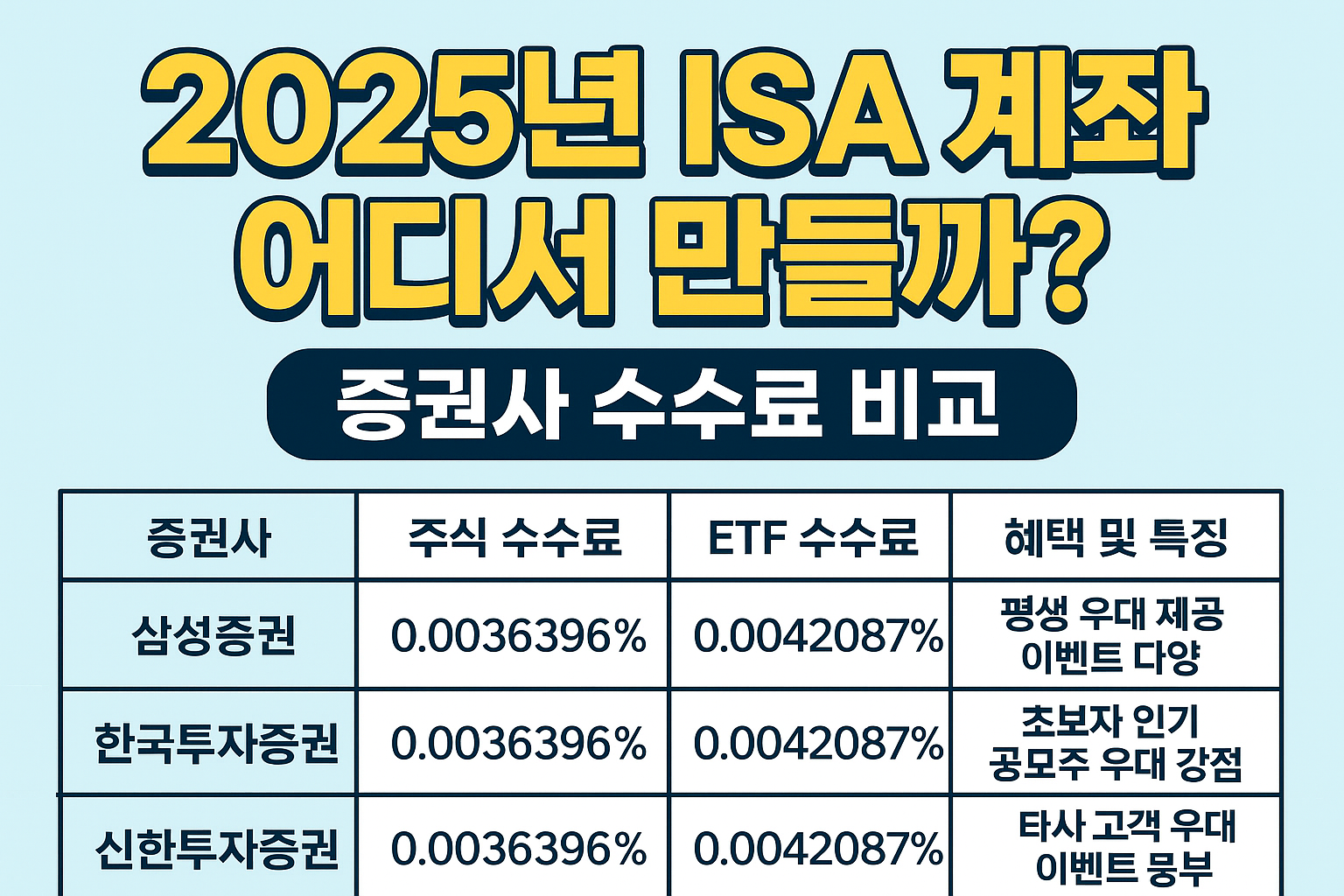 이 글에서는 2025년 기준 주요 증권사의 ISA 계좌 수수료, 우대 이벤트, ETF 거래 비용 등을 표로 비교하고, 실제 어떤 사람이 어떤 증권사를 선택하면 좋은지까지 상세하게 분석해 드립니다. ISA 계좌 개설 고민 중이라면 이 글 하나로 완전 정리 가능합니다!